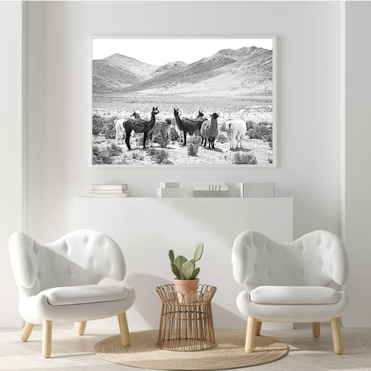 Alpaca in Mountain Valley Print | Scenery with Llamas in black & white