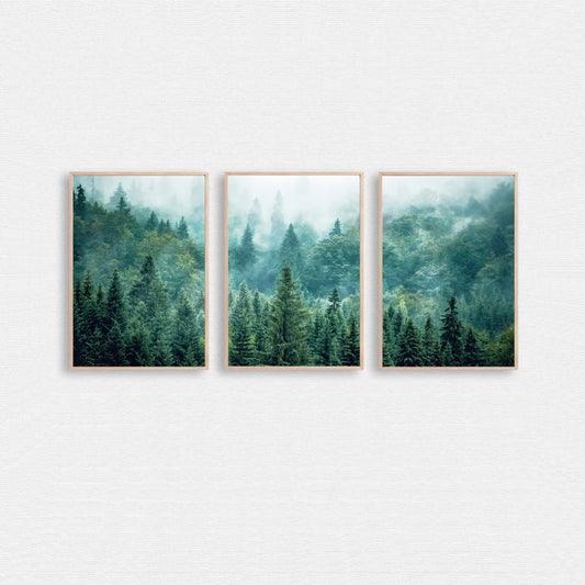 3 Piece Wall Art with Green Forest Panorama | Misty Forest Triptych