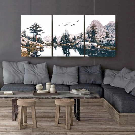 Autumn Nature Triptych with Lake and Birds | Mountain 3 Piece Wall Art