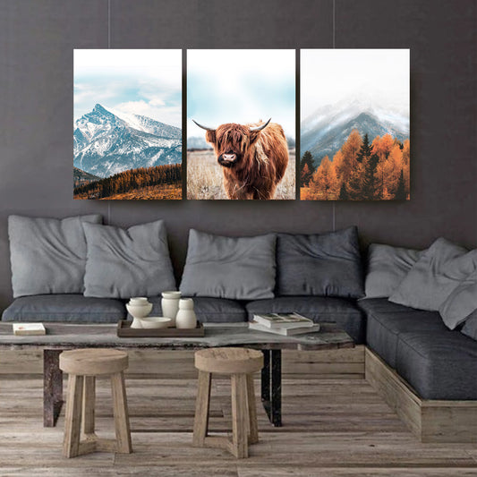 Autumn Mountains Scenery with Highland Cow Triptych | Fall Wall Decor