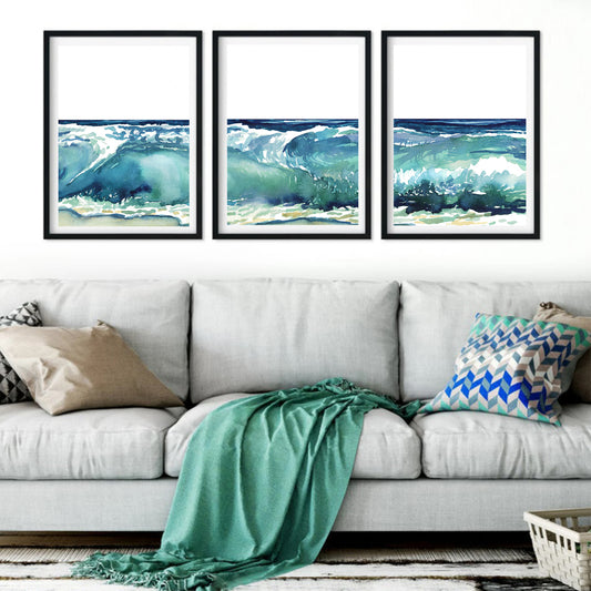Watercolor Painting of Blue Green Sea Waves | Sea Beach Triptych Art