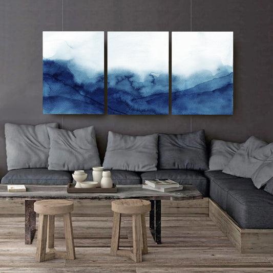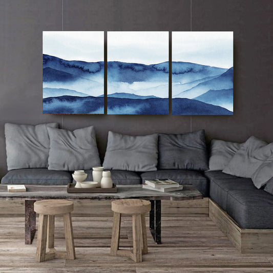 Dark Blue Watercolor Triptych Art Set with Abstract Mountain Landscape