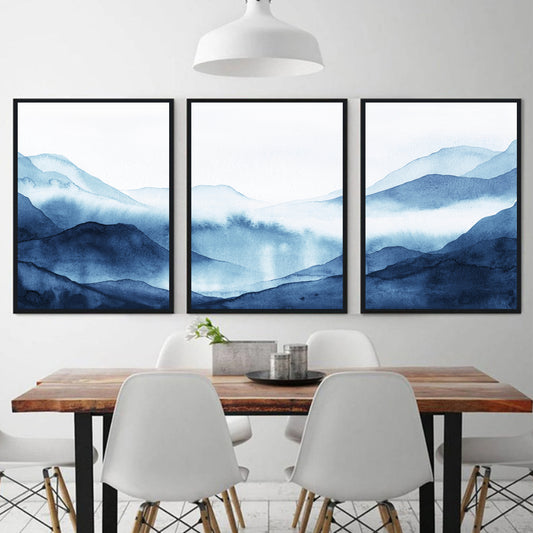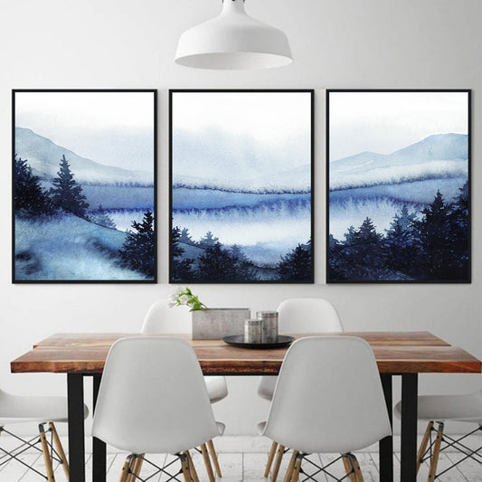 Mountain Triptych Art in Navy Blue | Watercolor Mountains Wall Art Set