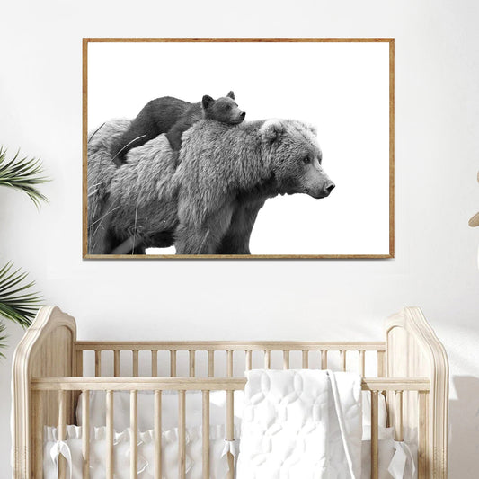 Bär mit Jungem Druck für Kinderzimmer | Zwei Bären Kinderzimmer Schwarz Weiß Foto