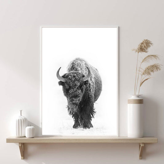 Bison im Winter Wandkunst | Bison mit Schnee Poster in Schwarz & Weiß
