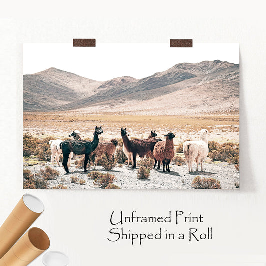 Alpaka im Bergtal Druck | Landschaft mit Lamas in neutraler Farbe