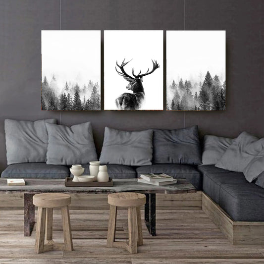 Hirsch im nebligen Kiefernwald Wandkunst | Hirschdruck mit nebliger Landschaft
