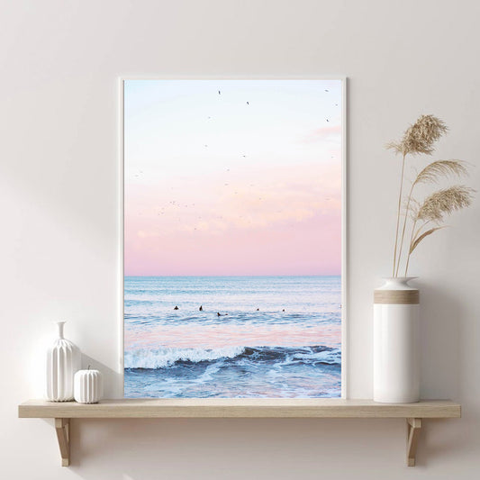 Impression sur toile représentant un lever de soleil sur l'océan avec un surfeur | Paysage côtier de Californie