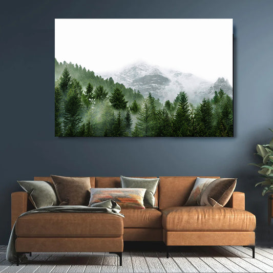 Misty Mountain Landscape Framed Print | Foggy Pine Forest Large Wall Art
