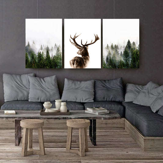 Cerf dans la forêt, triptyque sur toile en 3 parties | Cerf dans le brouillard