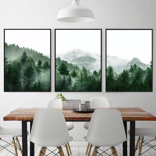 Triptyque Forêt verte | Paysage de montagne brumeux, décoration murale en 3 parties