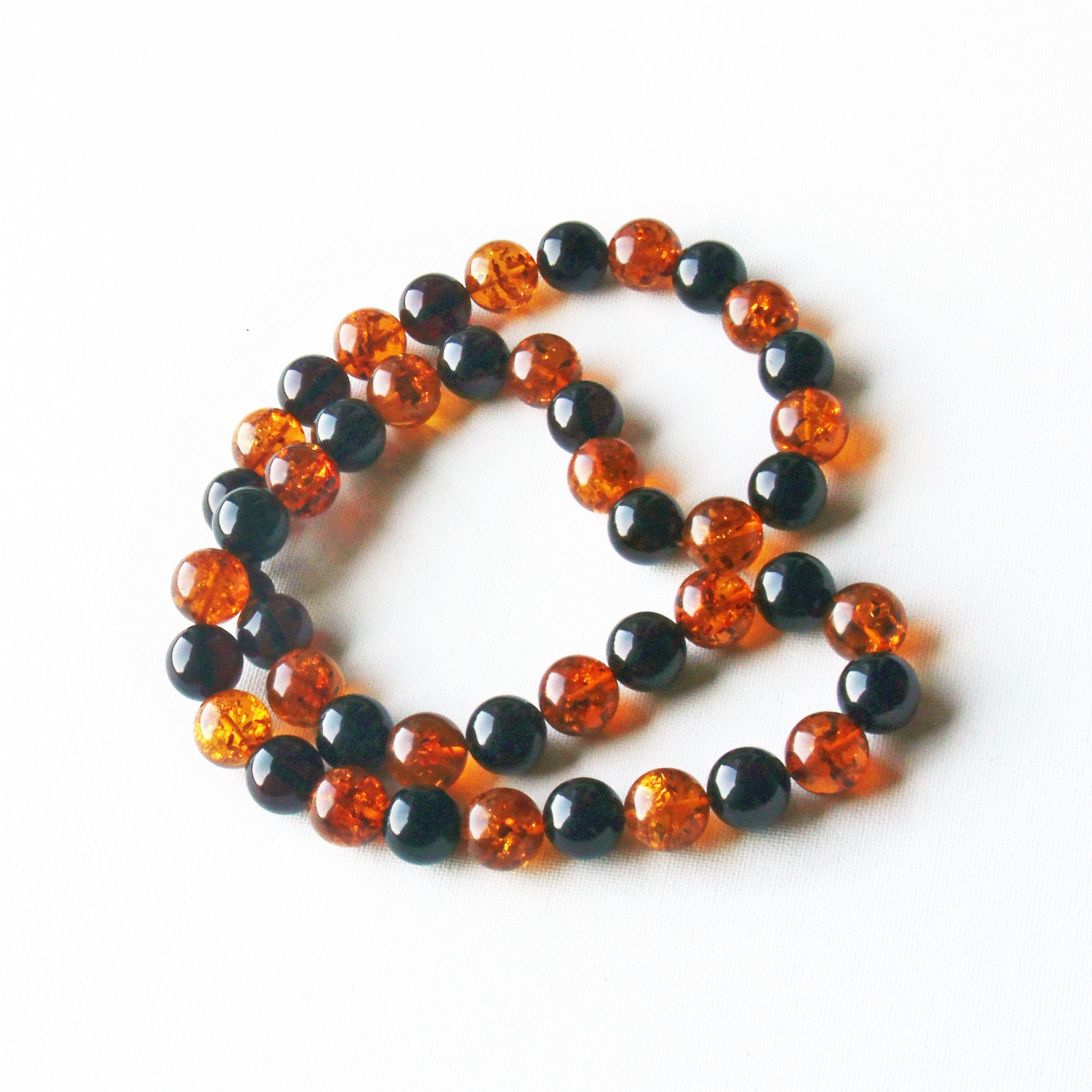 This is a bright necklace made of massive round beads of natural Baltic amber. Amber beads are made of pressed amber of dark red and bright orange colors. Intense but uniform red and orange colors are obtained as a result of a technological process with heating of the mineral, during which air bubbles inside the amber disappear.