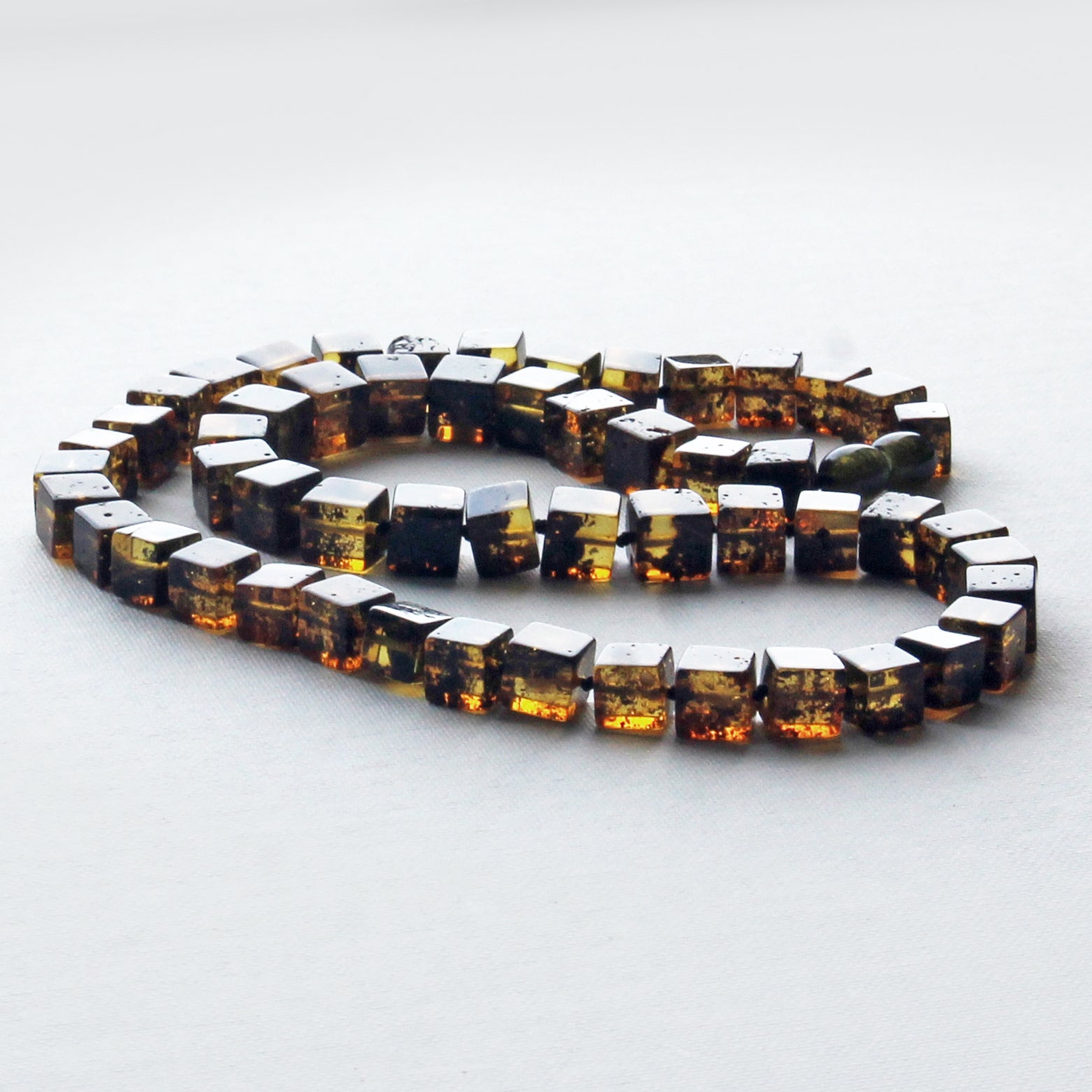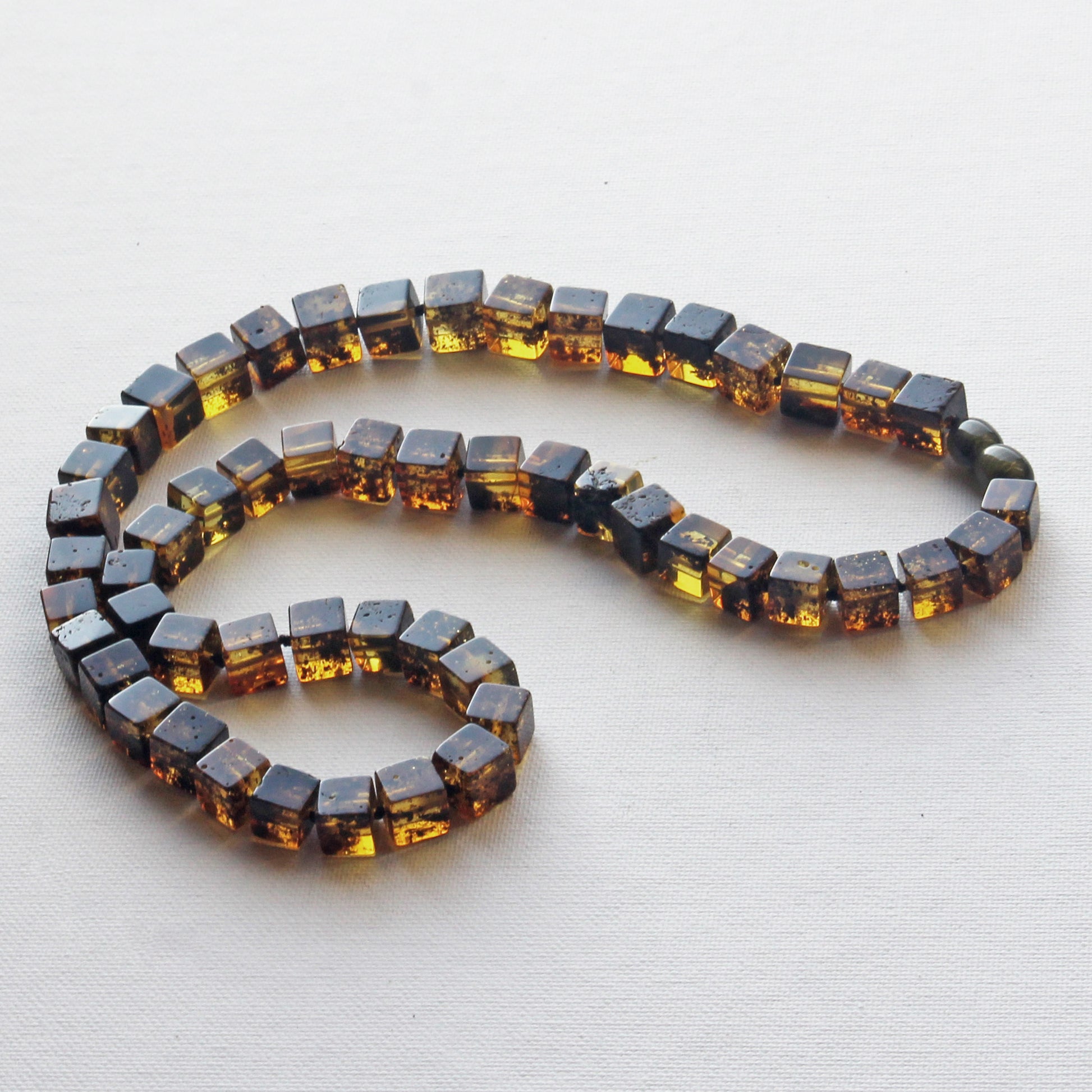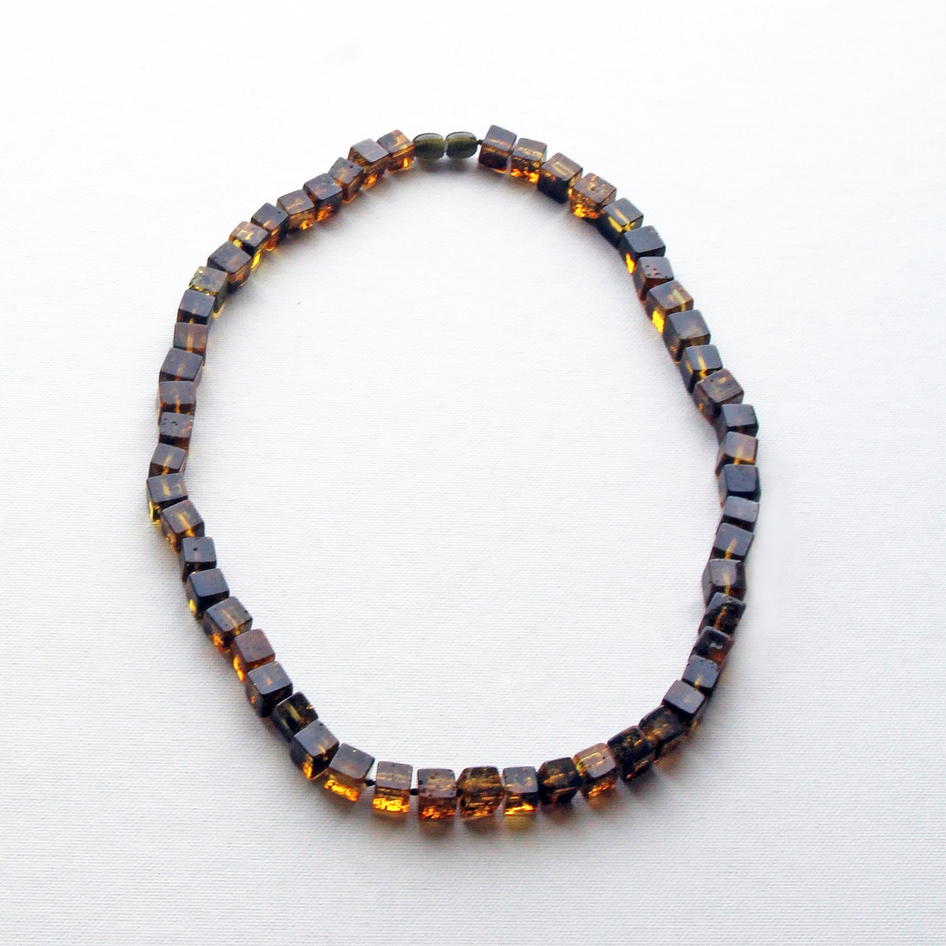 Modern beautiful necklace made of polished brown and yellow amber cubic beads. The beads are strung on a strong thread and separated by protective knots to avoid friction and damage to the amber cubes. Very simple and stylish jewelry for men or women. #0065