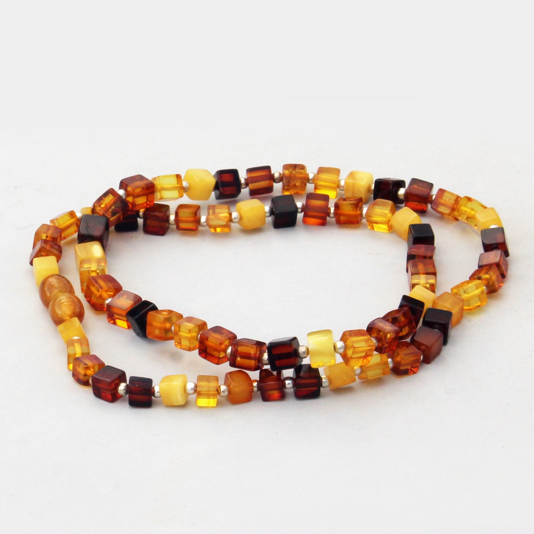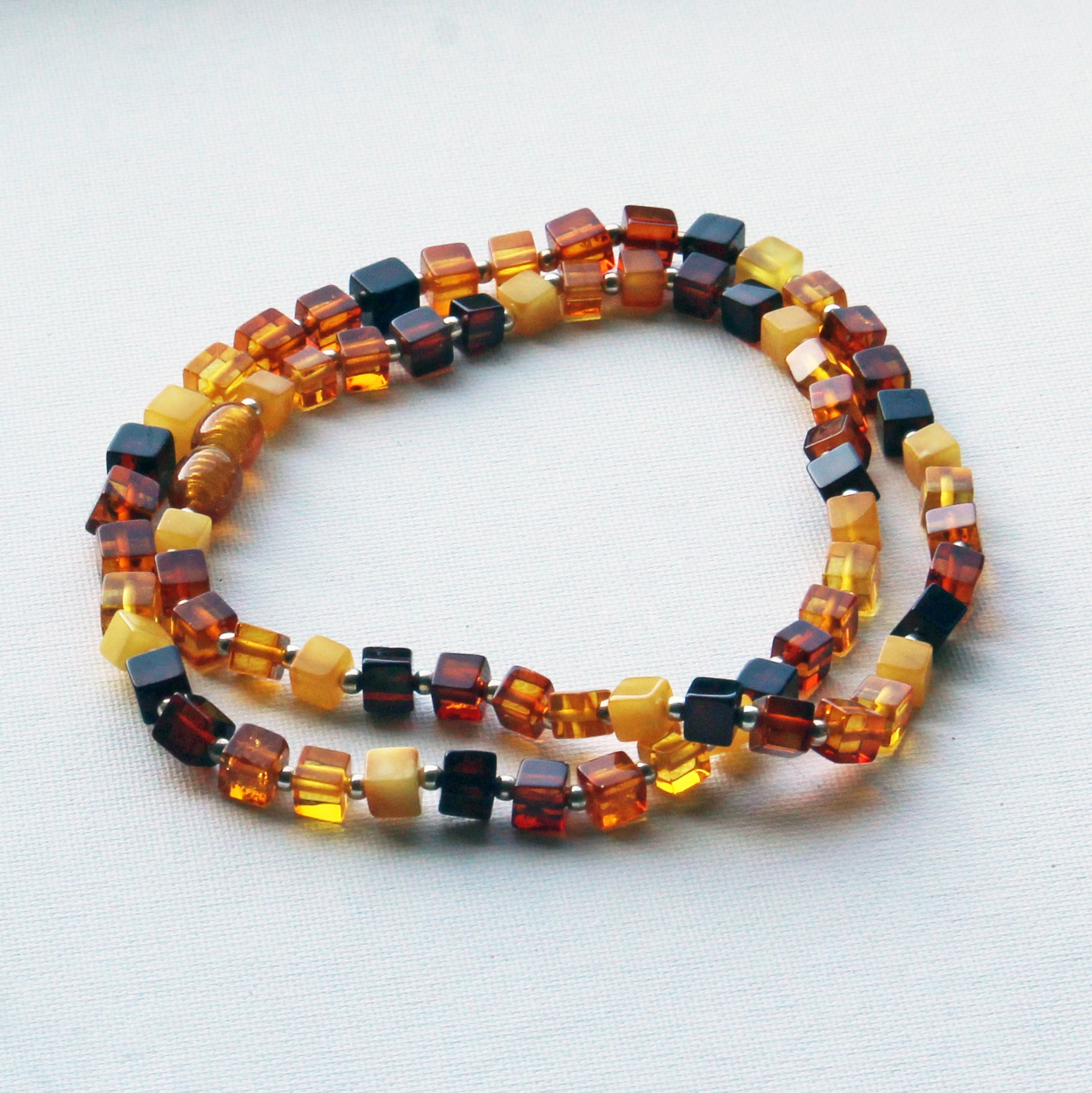 Modern beautiful necklace made of polished orange, brown, yellow and red amber cubic beads. The beads are strung on a strong thread and separated by protective balls to avoid friction and damage to the amber cubes. Very simple and stylish jewelry for women or men. Amber cubes look very beautiful in the sun rays. #0037.